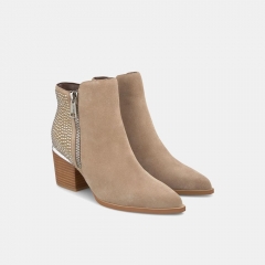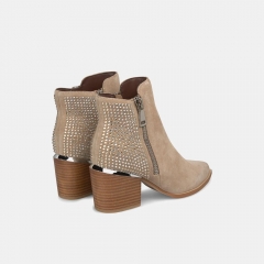 Botín de tacón de mujer con tachas y cremallera lateral. Puntera redondeada cierre con cremallera. La altura del tacón de tipo bloque es de 7,3cm y la altura de la caña es de 15cm.