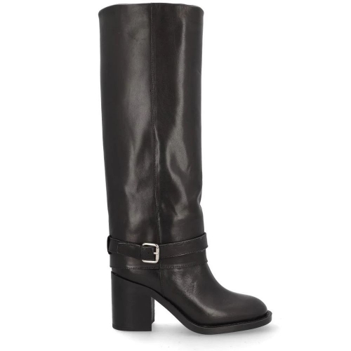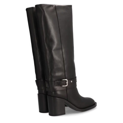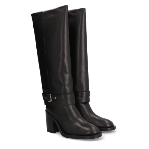 Bota para mujer ALPE SELENA fabricado en piel ( becerro) de color negro con tacón de 7, 5 cm, suela antideslizante y puntera redonda, sin cierre y caña alta.