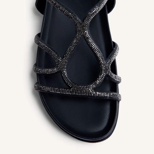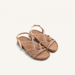 Sandalias planas de piel con pedrería. Cuentan con cierres ajustables en el tobillo y planta anatómica, que favorece una posición correcta y evita las sobrecargas musculares.