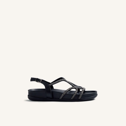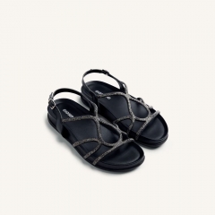 Sandalias planas de piel con pedrería. Cuentan con cierres ajustables en el tobillo y planta anatómica, que favorece una posición correcta y evita las sobrecargas musculares.