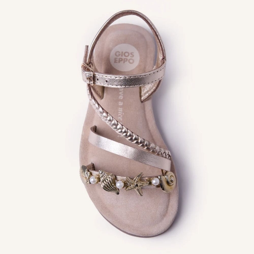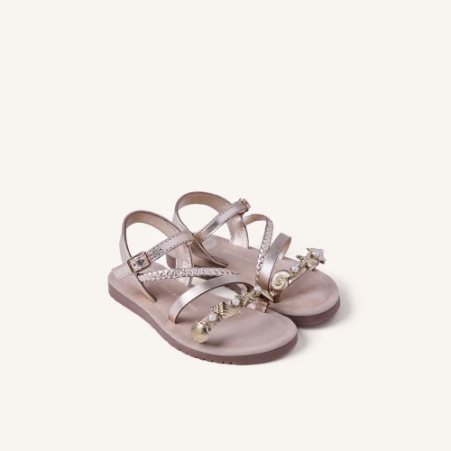 Sandalias de piel metalizada con abalorios y trenzado. Cuentan con cierres ajustables en el tobillo y planta de piel serraje, suave y acolchada. Las posibles arrugas y diferencias en la piel o en el montado entre ambos pies son debidas al proceso artesanal y al uso de pieles naturales.