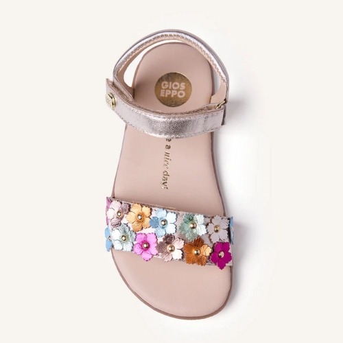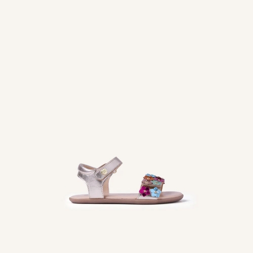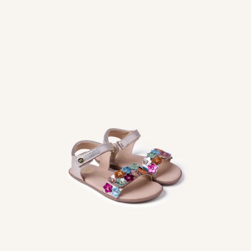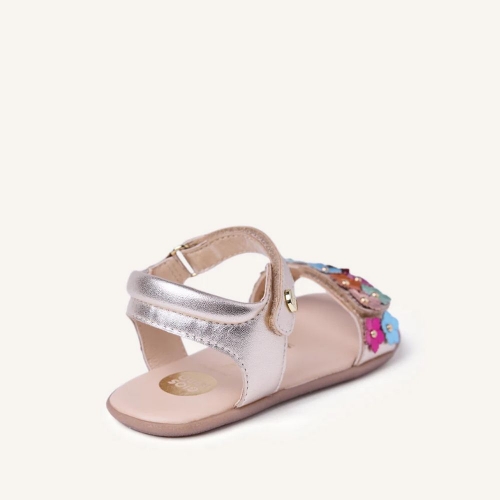 Sandalias de piel metalizada con tachas y detalle bicolor de flores. Planta estampada. Diseñadas siguiendo las tendencias minimalistas para garantizar la pisada natural. Cuentan con cierres ajustables en el tobillo y en el empeine.