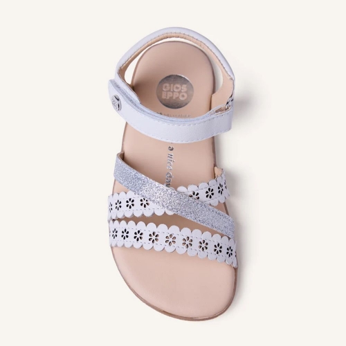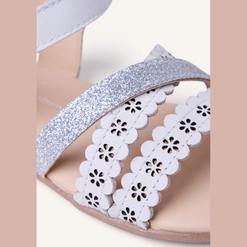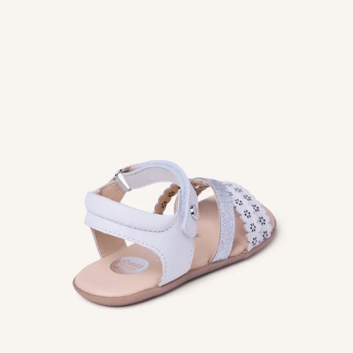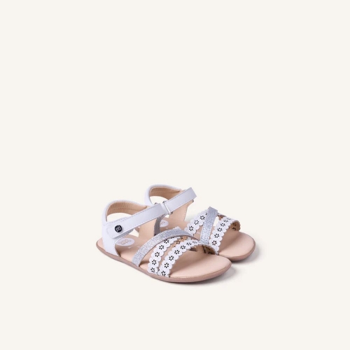 Sandalias de piel calada con flores y detalles brillantes. Diseñadas siguiendo las tendencias minimalistas para garantizar la pisada natural. Cuentan con cierres ajustables en el tobillo.