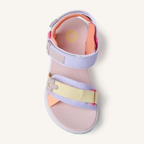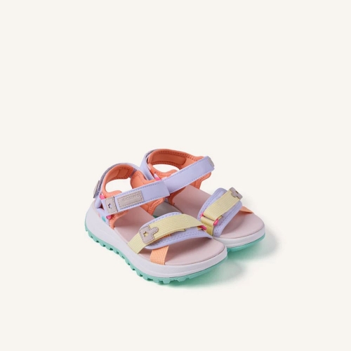 Sandalias estilo deportivas con contrastes de color. Suela tipo track. Cuentan con cierres ajustables en el empeine y en el tobillo.