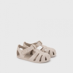 Cangrejera diseñada en concepto barefoot medium, cero drop, flexible y blandita, fabricada con al menos un 50% de pvc reciclado libre de ftalatos y cierre adherente.