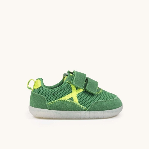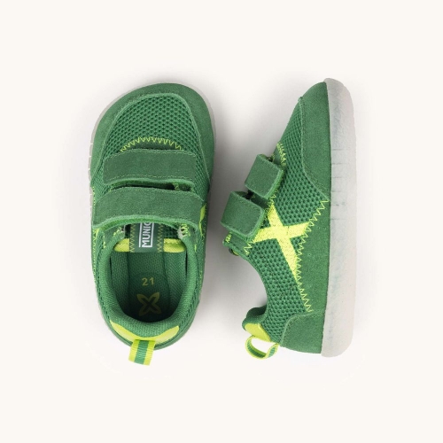 Este calzado infantil presenta un diseño vibrante en color verde césped, confeccionado con una malla técnica transpirable y refuerzos de ante suave que garantizan durabilidad y confort. El modelo destaca por su icónico logotipo "X" en color amarillo flúor y un sistema de doble cierre de velcro que asegura una sujeción perfecta y facilita el calce en los pies más pequeños. Gracias a su suela de goma blanca con relieve antideslizante y estructura flexible, es la opción ideal para que los niños exploren con seguridad sus primeros pasos, asistan a la guardería con un estilo moderno o disfruten de actividades al aire libre con total libertad de movimiento.