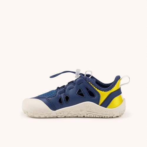 Esta zapatilla infantil de verano destaca por su diseño ergonómico y refrescante que combina el azul navy con detalles en amarillo vibrante y una suela blanca decorada. El modelo Barefoot ofrece una pisada natural y versátil, con un marcado estilo sport, incorporando una horma con la forma natural de los dits de los pies y una suela media de mínimo grosor que aporta un contacto más cercano al suelo y una gran flexibilidad. Resulta ideal para jornadas de juego en el parque, excursiones familiares o para el uso diario en climas cálidos gracias a sus aberturas laterales que favorecen la ventilación. Limpieza este modelo se puede poner en la lavadora, permitiendo que luzcan siempre como nuevas sin esfuerzo. Su cierre elástico con tanca permite que los más pequeños ganen autonomía al calzarse solos con total seguridad.