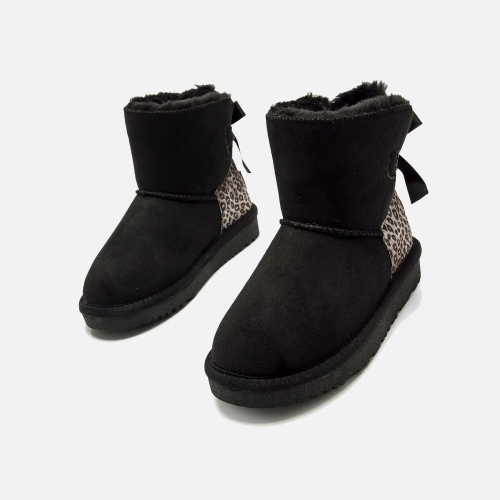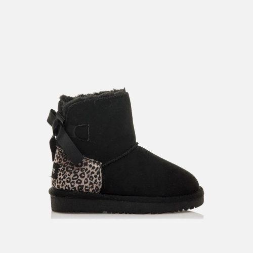 Botín de pelo para niña, modelo Sky de Mustang de color negro. Este botín apreski cuenta con refuerzo trasero en estampado animal print de leopardo que le da un toque atrevido y divertido. El interior forrado aporta calidez durante los meses más fríos, y el lazo decorativo en la parte trasera añade un extra de estilo. Su suela plana ofrece estabilidad y comodidad para un uso diario, perfecto tanto para el colegio como para paseos invernales.