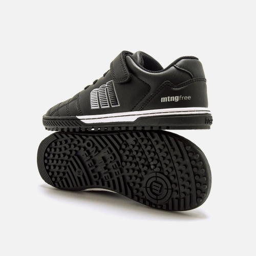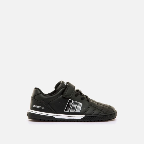 Zapatilla de fútbol barefoot de color negro con detalles blancos para niño de la marca Mustang, modelo Free Play. Diseñada para ofrecer mayor durabilidad, incorpora puntera reforzada que protege el corte de la abrasión por contacto con el suelo. Cierre adhesivo de cosido reforzado que garantiza un ajuste seguro y práctico. La suela de goma incluye pequeños tacos que mejoran la tracción y el agarre. Diseñado y desarrollado especialmente en colaboración con el Dr. Juanjo López, traumatólogo deportivo e infantil, para respetar el desarrollo natural del pie del niño y la niña. Gracias a su puntera ancha permite el libre movimiento de los dedos dentro del zapato. Las plantillas extraíbles facilitan comprobar si la talla del calzado es la correcta para tu hijo. Además, su fácil apertura facilita que el niño pueda descalzarse y calzarse de forma autónoma.