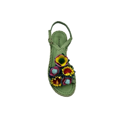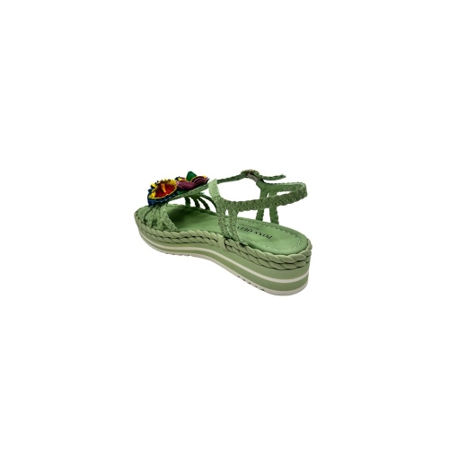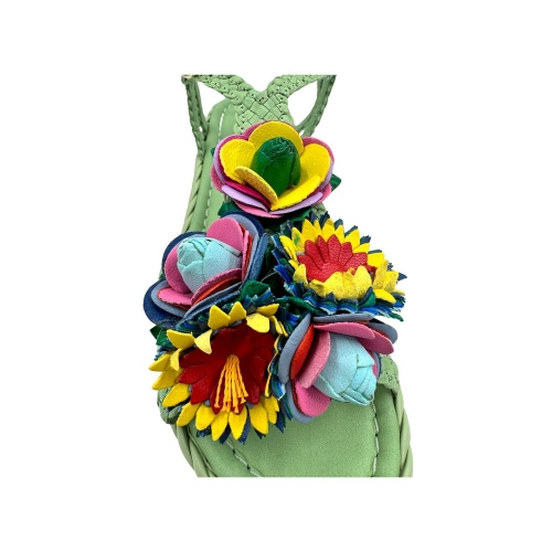 Sandalia de plataforma MILAN en piel trenzada a mano color pistacho. Flores de piel hechas a mano en empeine. Cierre mediante hebilla en el tobillo Tubular de efecto cuerda alrededor de plataforma. Piso bicolor a tono. Suela de goma antideslizante. Altura delantera 3 cm y trasera 4,5 cm.