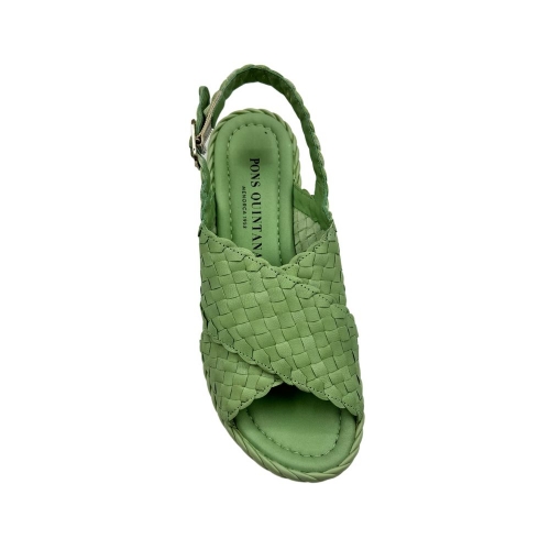 Sandalia de plataforma MILAN realizada en piel trenzada a mano color pistacho. Pala cruzada. Cierre mediante hebilla en el tobillo. Tubular alrededor de la plataforma con efecto cuerda a tono. Piso bicolor a tono. Suela de goma antideslizante. Altura delantera 3 cm y trasera 4,5 cm.