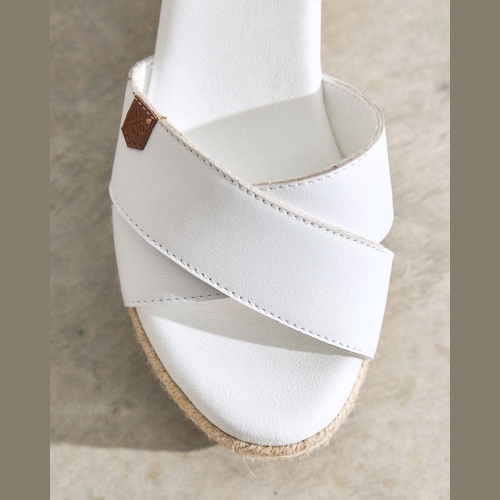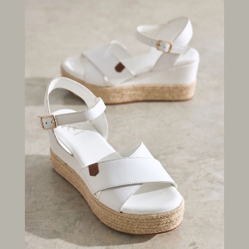 Sandalia de cuña baja para mujer con palas entrelazadas en blanco.