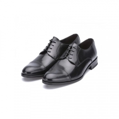 Zapato de caballero tipo blucher en piel bahía marrón con suela de cuero. Detalle de línea recta en la punta.