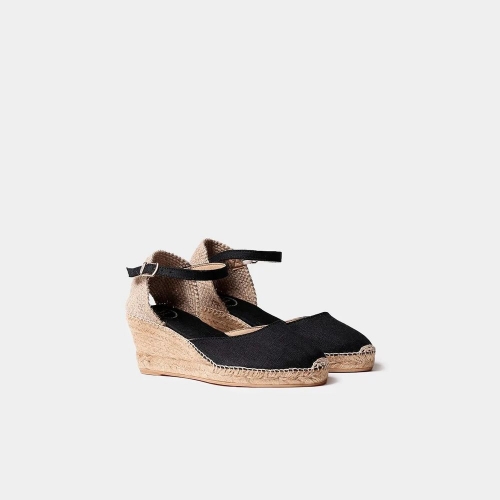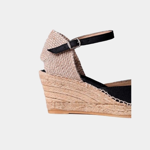 Esta alpargata de cuña con cierre de hebilla está elaborada en tonos lisos. Tiene una altura total de 7 cm, de los cuales 5 cm pertenecen al tacón y 2 cm a la plataforma. Toda la cuña está hecha de yute y la suela interior está forrada en tejido. Este diseño está cosido a mano en España. La base de la suela es de goma antideslizante. Esta alpargata es 100% vegana.