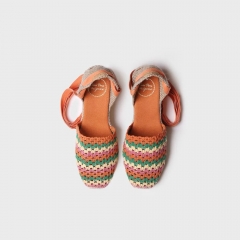 Esta alpargata de cuña de mujer está elaborada en tejido tipo crochet multicolor. Cuenta con una punta cerrada y dos cintas para anudarla. La suela de yute tiene una altura total de 7,5 cm. Tiene una plantilla acolchada de algodón que le da gran comodidad y la base de la suela es de goma antideslizante. Se trata de un modelo vegano cosido a mano en España.