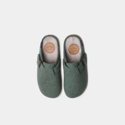 Esta zapatilla de casa de mujer se elabora en fieltro. Dispone de una hebilla para asegurar un ajuste y sujeción perfecta al pie. La suela es de goma antideslizante y tiene 3 cm de grosor. Cuenta con una plantilla interior forrada en suave pelo sintético para asegurar el mayor confort.