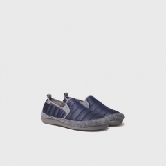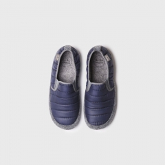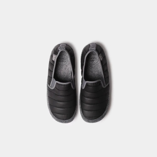 Esta zapatilla de casa cerrada para hombre combina tejido acolchado y fieltro. La suela es plana y tiene 3 cm de grosor. La suela es de goma antideslizante. Cuenta con una plantilla extraíble con una altura de 2 cm en la parte del talón. Lleva un forro interior de suave pelo sintético y dispone de un tirador para facilitar su colocación.