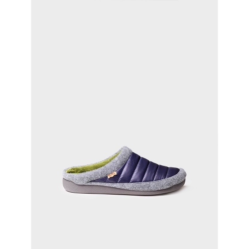 Esta zapatilla de casa tipo zueco para hombre combina tejido acolchado y fieltro. La suela es plana y tiene 3 cm de grosor. La suela es de goma antideslizante. Cuenta con una plantilla extraíble con una cuña de 2 cm de grosor en la parte del talón. Lleva un forro interior de suave pelo sintético.