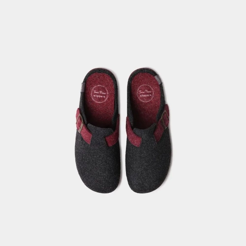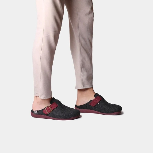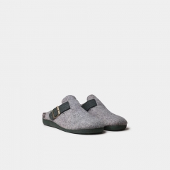 Esta zapatilla de casa tipo zueco para hombre está confeccionada en fieltro reciclado. Cuanta con una hebilla regulable para poder ajustar esta slipper. Un modelo muy cómodo que te acompañará todo el invierno. La suela, la plantilla y la tira ajustable están hechas en un color contrastado. La suela es de goma antideslizante y tiene 3 cm de grosor.
