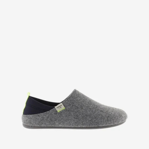Zapatillas de casa marino para hombre. Fabricadas en España. Combinan fieltro reciclado, trasera de neopreno y tirador en contraste. Se pueden llevar calzadas o en modo destalonado gracias a la trasera de neopreno.