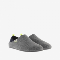 Zapatillas de casa marino para hombre. Fabricadas en España. Combinan fieltro reciclado, trasera de neopreno y tirador en contraste. Se pueden llevar calzadas o en modo destalonado gracias a la trasera de neopreno.