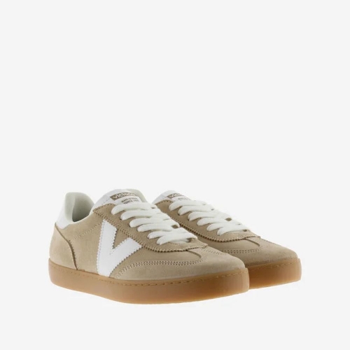 Zapatillas unisex fabricadas en España en serraje de colores. V de victoria lateral y pieza trasera en blanco en contraste. Cierre mediante cordones también blancos y costuras a contraste. Suela de T.R. traslúcido color caramelo.