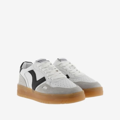 Zapatillas deportivas unisex fabricadas en material efecto piel y piezas de serraje. V del lateral en colores negro y blanco, a juego con la pieza trasera con el logotipo de la marca. Cierre mediante cordones al tono. Detalle en forma de ventana en el lateral. Suela en color caramelo de 3,5 cm. Incluyen una plantilla extraíble acolchada para mayor confort.