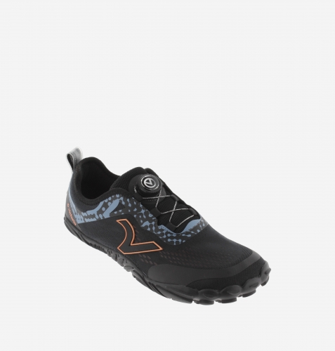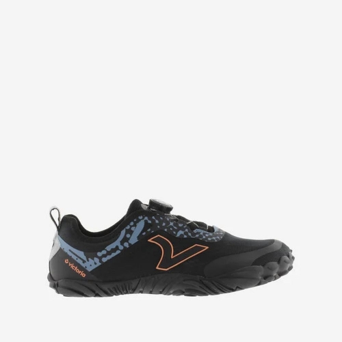Zapatillas negras barefoot unisex de rejilla. V de victoria lateral y grabado de la marca en naranja flúor en contraste. Cierre mediante cordones elásticos con sistema autobloqueante, que permiten un ajuste rápido y cómodo sin necesidad de anudar. Cuentan además con un tirador trasero para facilitar el calce. Suela de goma que las hace muy cómodas y ligeras. Suela de goma con diseño ondulado y volumen, que aporta agarre y estabilidad.