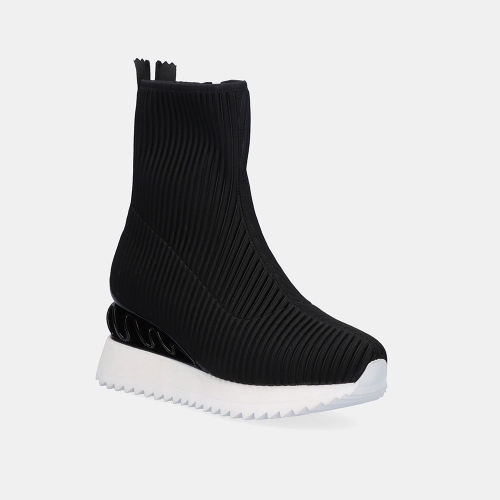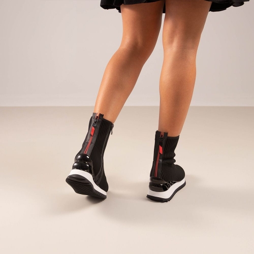 Esta temporada hazte con el calzado más deseado con estos botines de licra Exé en el más riguroso color black. El contraste de su color negro junto con la suela blanca es el toque significativo ideal para tus looks cotidianos. Botines con cuña en color black. Su corte y plantilla son de mateiral textil, la suela es de mateiral sintético. Cuenta con una cuña de 6 cm, la caña tiene una altura de 16 cm y cierre de cremallera.