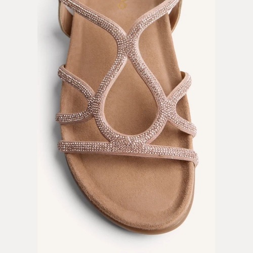 Sandalias planas de piel con pedrería. Cuentan con cierres ajustables en el tobillo y planta anatómica, que favorece una posición correcta y evita las sobrecargas musculares.