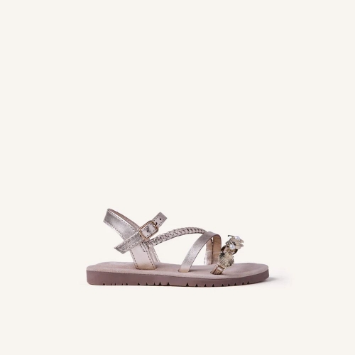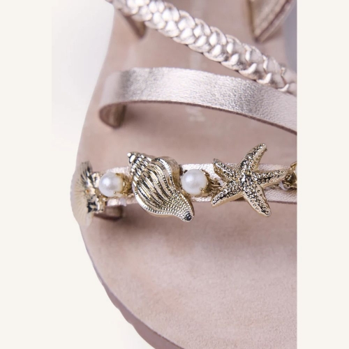 Sandalias de piel metalizada con abalorios y trenzado. Cuentan con cierres ajustables en el tobillo y planta de piel serraje, suave y acolchada. Las posibles arrugas y diferencias en la piel o en el montado entre ambos pies son debidas al proceso artesanal y al uso de pieles naturales.