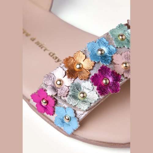 Sandalias de piel metalizada con tachas y detalle bicolor de flores. Planta estampada. Diseñadas siguiendo las tendencias minimalistas para garantizar la pisada natural. Cuentan con cierres ajustables en el tobillo y en el empeine.