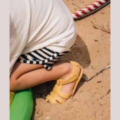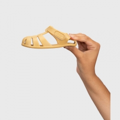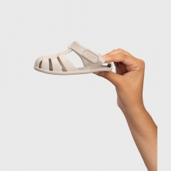 Cangrejera diseñada en concepto barefoot, cero drop, flexible y blandita, fabricada con al menos un 50% de pvc reciclado libre de ftalatos y cierre adherente.