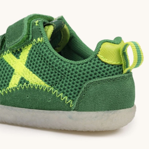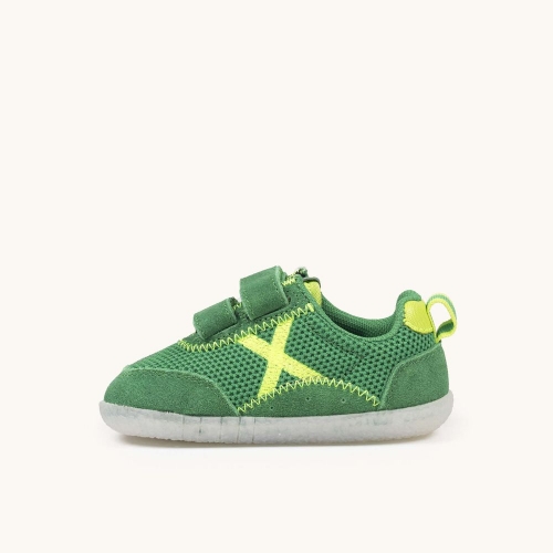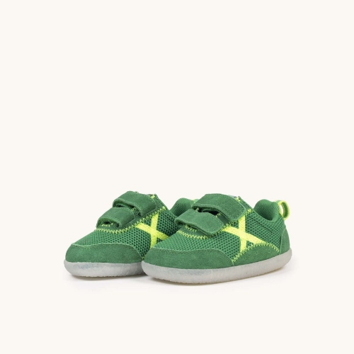 Este calzado infantil presenta un diseño vibrante en color verde césped, confeccionado con una malla técnica transpirable y refuerzos de ante suave que garantizan durabilidad y confort. El modelo destaca por su icónico logotipo "X" en color amarillo flúor y un sistema de doble cierre de velcro que asegura una sujeción perfecta y facilita el calce en los pies más pequeños. Gracias a su suela de goma blanca con relieve antideslizante y estructura flexible, es la opción ideal para que los niños exploren con seguridad sus primeros pasos, asistan a la guardería con un estilo moderno o disfruten de actividades al aire libre con total libertad de movimiento.