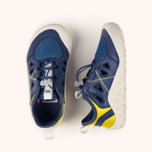 Esta zapatilla infantil de verano destaca por su diseño ergonómico y refrescante que combina el azul navy con detalles en amarillo vibrante y una suela blanca decorada. El modelo Barefoot ofrece una pisada natural y versátil, con un marcado estilo sport, incorporando una horma con la forma natural de los dits de los pies y una suela media de mínimo grosor que aporta un contacto más cercano al suelo y una gran flexibilidad. Resulta ideal para jornadas de juego en el parque, excursiones familiares o para el uso diario en climas cálidos gracias a sus aberturas laterales que favorecen la ventilación. Limpieza este modelo se puede poner en la lavadora, permitiendo que luzcan siempre como nuevas sin esfuerzo. Su cierre elástico con tanca permite que los más pequeños ganen autonomía al calzarse solos con total seguridad.