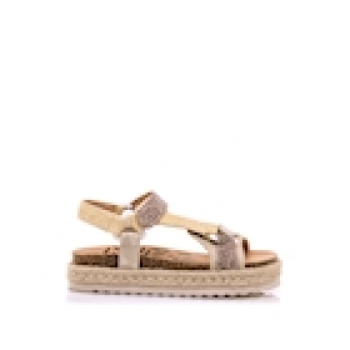 Sandalias de plataforma de color beige con detalles metalizados y estampado animal para niña, modelo Padme de la marca Mustang. Este modelo combina tiras anchas con cierre ajustable adhesivo en el tobillo, facilitando la sujeción del pie. La plataforma con acabado de rafia refuerza su aire natural, mientras la mezcla de tonos neutros permite combinarlas fácilmente con prendas frescas y desenfadadas. Una opción práctica y versátil para los días de calor.