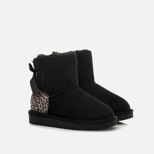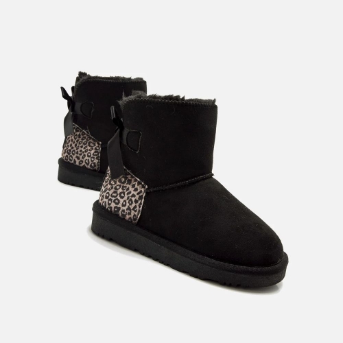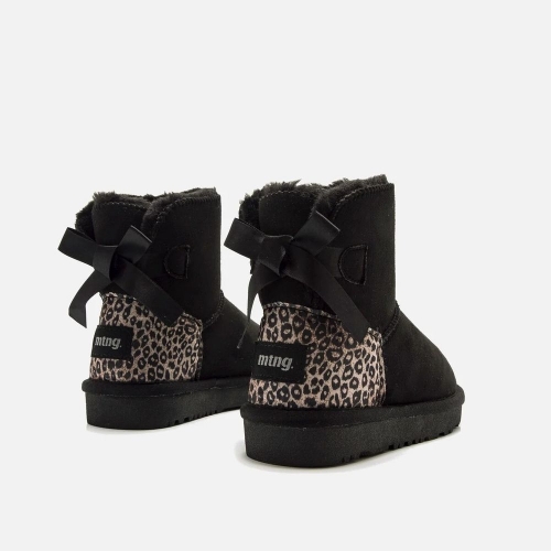 Botín de pelo para niña, modelo Sky de Mustang de color negro. Este botín apreski cuenta con refuerzo trasero en estampado animal print de leopardo que le da un toque atrevido y divertido. El interior forrado aporta calidez durante los meses más fríos, y el lazo decorativo en la parte trasera añade un extra de estilo. Su suela plana ofrece estabilidad y comodidad para un uso diario, perfecto tanto para el colegio como para paseos invernales.