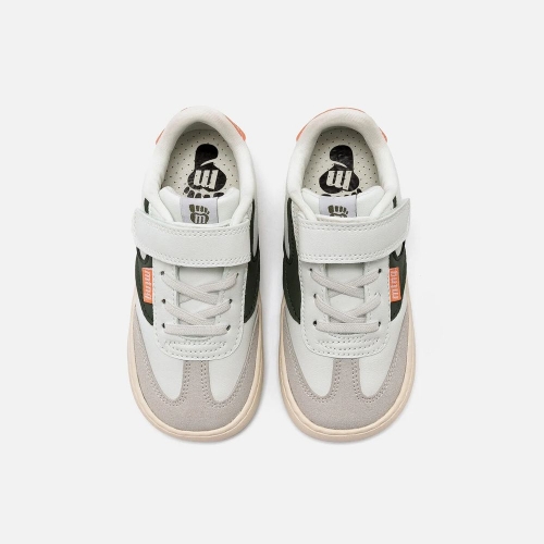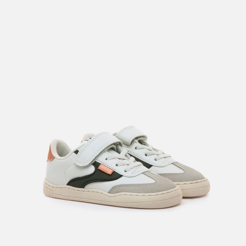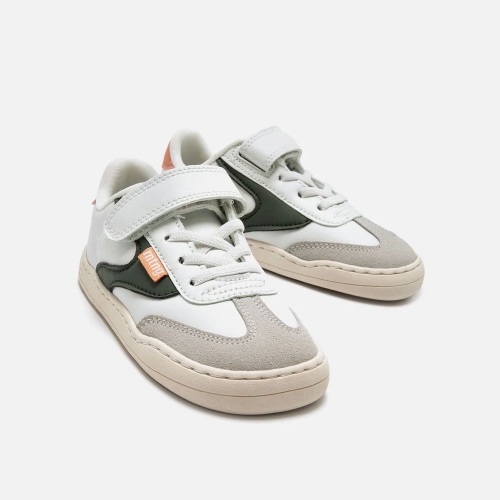 Zapatillas barefoot tipo deportivas para niños de la marca Mustang, modelo Free de color blanco. Incorpora detalles de color verde kaki y gris claro, además de una pieza trasera en tono salmón. El cierre combina cordones elásticos y tira adherente para un ajuste práctico y rápido. Diseñado y desarrollado especialmente en colaboración con el Dr. Juanjo López, traumatólogo deportivo e infantil, para respetar el desarrollo natural del pie del niño y la niña. Gracias a su puntera ancha permite el libre movimiento de los dedos dentro del zapato. Las plantillas extraíbles facilitan comprobar si la talla del calzado es la correcta para tu hijo. Además, su fácil apertura facilita que el niño pueda descalzarse y calzarse de forma autónoma. Con certificado VEGANO sellado por INESCOP, el cual garantiza que la naturaleza química principal del material no se corresponde con fibras de origen animal.