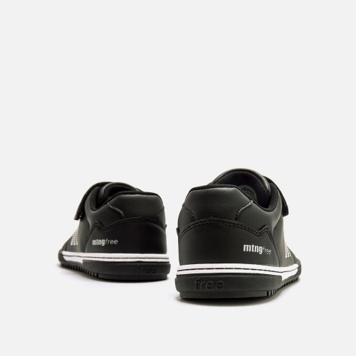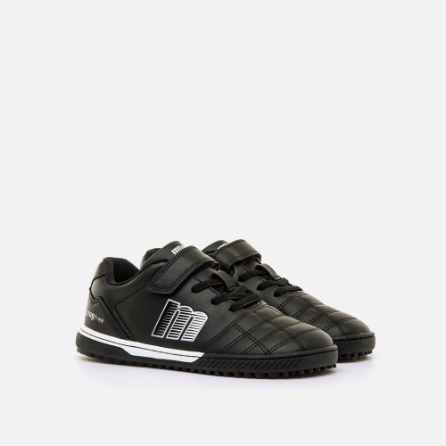 Zapatilla de fútbol barefoot de color negro con detalles blancos para niño de la marca Mustang, modelo Free Play. Diseñada para ofrecer mayor durabilidad, incorpora puntera reforzada que protege el corte de la abrasión por contacto con el suelo. Cierre adhesivo de cosido reforzado que garantiza un ajuste seguro y práctico. La suela de goma incluye pequeños tacos que mejoran la tracción y el agarre. Diseñado y desarrollado especialmente en colaboración con el Dr. Juanjo López, traumatólogo deportivo e infantil, para respetar el desarrollo natural del pie del niño y la niña. Gracias a su puntera ancha permite el libre movimiento de los dedos dentro del zapato. Las plantillas extraíbles facilitan comprobar si la talla del calzado es la correcta para tu hijo. Además, su fácil apertura facilita que el niño pueda descalzarse y calzarse de forma autónoma.