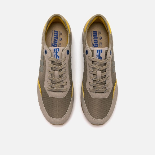 Zapatillas de color amarillo con detalles beige y negro para hombre de la marca Mustang, modelo Joggo, con inspiración retro running. Su diseño combina paneles en contraste y una suela con franja roja que aporta un estilo dinámico y juvenil. Incorpora logotipo lateral en relieve, talonera con inscripción '1967' y ojales metálicos que refuerzan su carácter deportivo. Equipadas con plantillas con tecnología Starfit, que mejoran la comodidad en cada paso. Con certificado VEGANO sellado por INESCOP, el cual garantiza que la naturaleza química principal del material no se corresponde con fibras de origen animal.