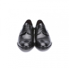 Zapato de caballero tipo blucher en piel bahía marrón con suela de cuero. Detalle de línea recta en la punta.