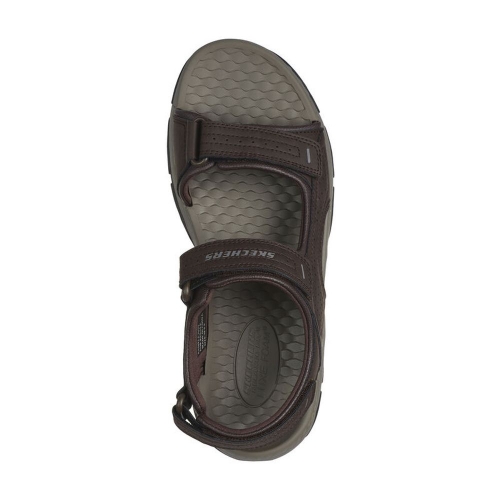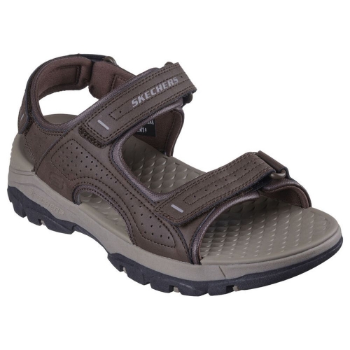 Viaja todo el día con la comodidad duradera de la sandalia Skechers Tresmen - Garo. Esta sandalia abierta Relaxed Fit presenta una parte superior sintética duradera con una plantilla Luxe Foam con amortiguación y un cierre de correa de tobillo de velcro.
