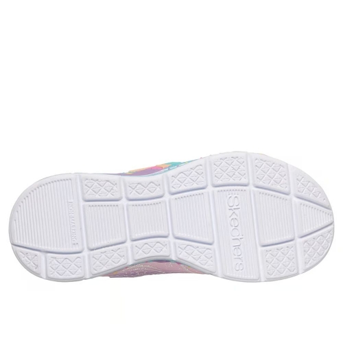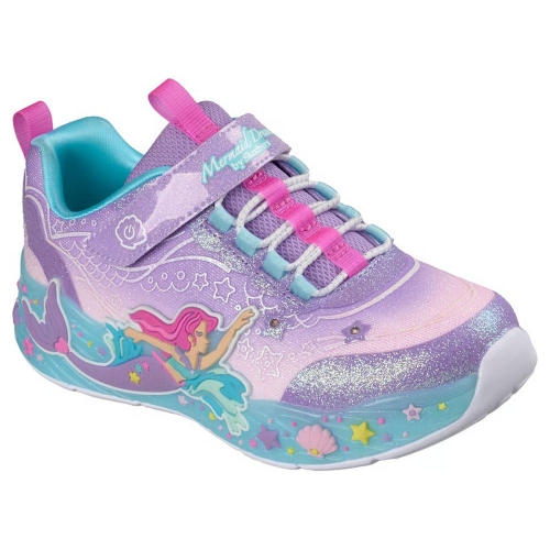 Deslumbra y derrocha estilo con Skechers S-Lights® Mermaid Dreams. Este modelo deportivo con luces de la Magical Collection™ cuenta con una parte superior de malla y material sintético con acabado brillante y con un gráfico de estilo sirena, cordones elásticos, cierre Skechers Adaptive Closure y una cómoda plantilla con amortiguación.