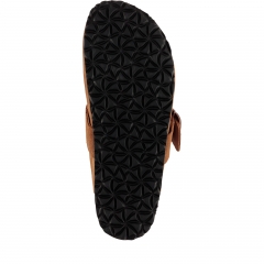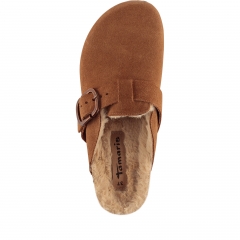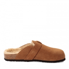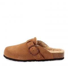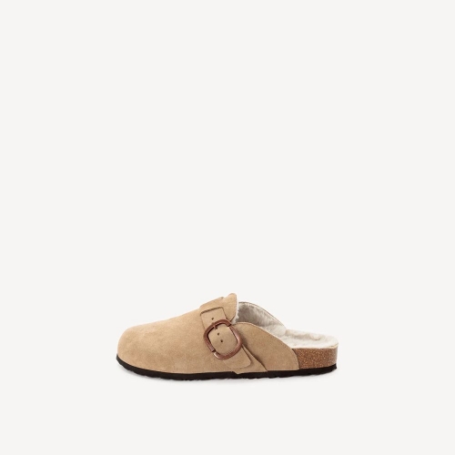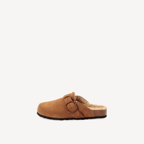 Zueco de piel con forro de pelo sintético y adorno de hebilla en la pala.
