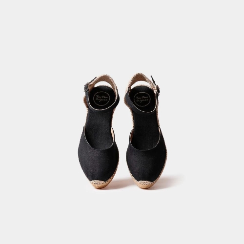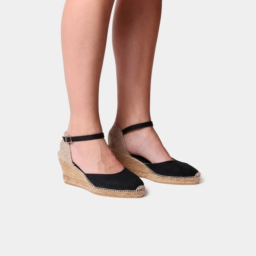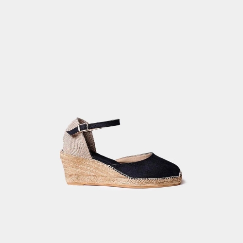 Esta alpargata de cuña con cierre de hebilla está elaborada en tonos lisos. Tiene una altura total de 7 cm, de los cuales 5 cm pertenecen al tacón y 2 cm a la plataforma. Toda la cuña está hecha de yute y la suela interior está forrada en tejido. Este diseño está cosido a mano en España. La base de la suela es de goma antideslizante. Esta alpargata es 100% vegana.