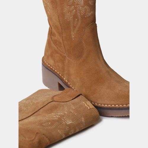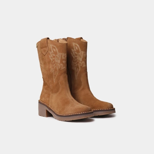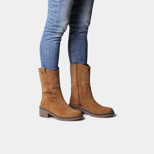 Estos botines de mujer, de estilo cowboy, están confeccionados en serraje e incluyen originales cenefas bordadas en la caña. Incorporan dos tiradores laterales y cremallera para facilitar el calce. Además, cuentan con una suela de goma antideslizante para mayor seguridad. La altura total de la suela es de 2,5 cm. La plantilla, acolchada y extraíble, ofrece un extra de comodidad.