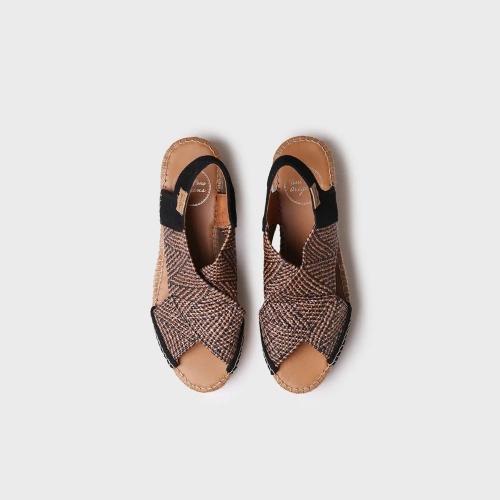 Esta alpargata de mujer cuenta con dos grandes tiras cruzadas elásticas multicolor. Se trata de un diseño abierto con una cuña de yute de 6,5 cm. La plantilla interior de piel está acolchada para una mayor comodidad y la base de la suela es de goma antideslizante. Este diseño está cosido a mano en España.