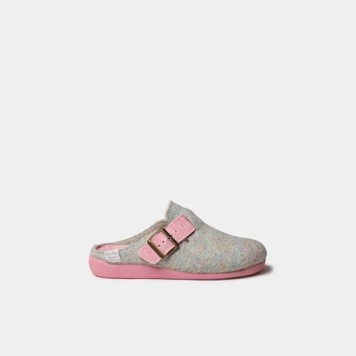 Estas zapatillas de casa de mujer se elaboran en fieltro reciclado. Disponen de una hebilla para asegurar un ajuste y sujeción perfecta al pie. La tira ajustable, la suela y la plantilla interior son en color contrastado, lo que le da a este modelo un toque original. La suela es de goma antideslizante y tiene 3 cm de grosor. Cuenta con una plantilla interior forrada en suave pelo sintético para asegurar el mayor confort.
