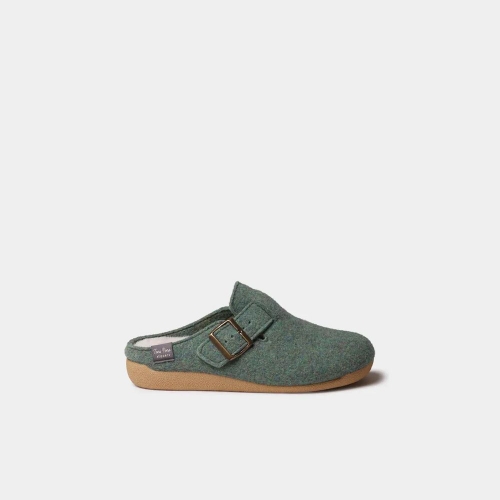 Esta zapatilla de casa de mujer se elabora en fieltro. Dispone de una hebilla para asegurar un ajuste y sujeción perfecta al pie. La suela es de goma antideslizante y tiene 3 cm de grosor. Cuenta con una plantilla interior forrada en suave pelo sintético para asegurar el mayor confort.