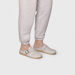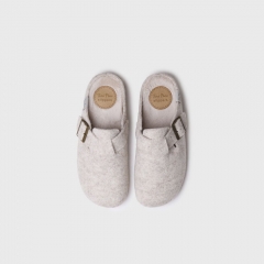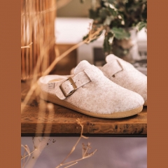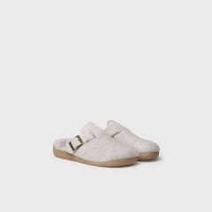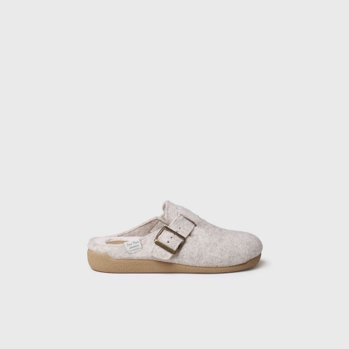 Esta zapatilla de casa de mujer se elabora en fieltro. Dispone de una hebilla para asegurar un ajuste y sujeción perfecta al pie. La suela es de goma antideslizante y tiene 3 cm de grosor. Cuenta con una plantilla interior forrada en suave pelo sintético para asegurar el mayor confort.